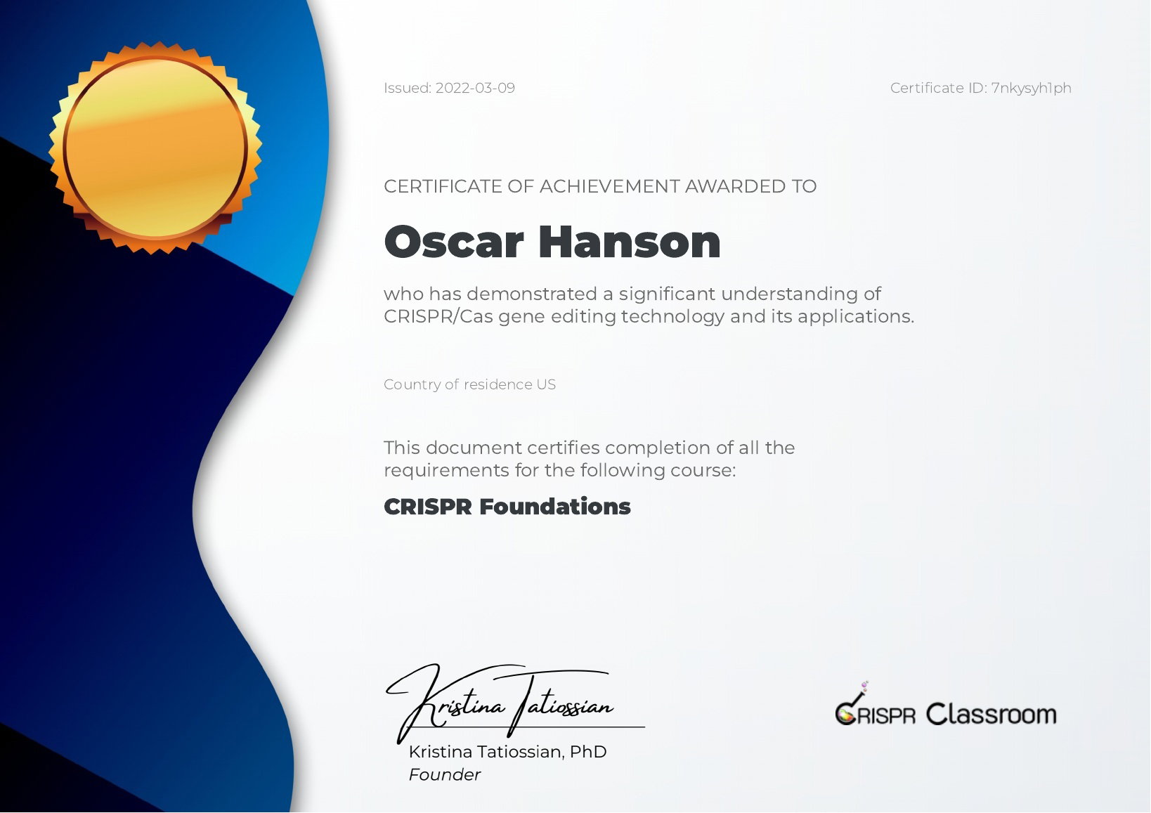 And then of course, there are the introduction and conclusion, and the final test, which is composed of fifty comprehensive questions about CRISPR Cas9 and all other content learned. One must pass the final test with a 90% or higher to receive their Certificate of Completion (students are given limitless attempts).
