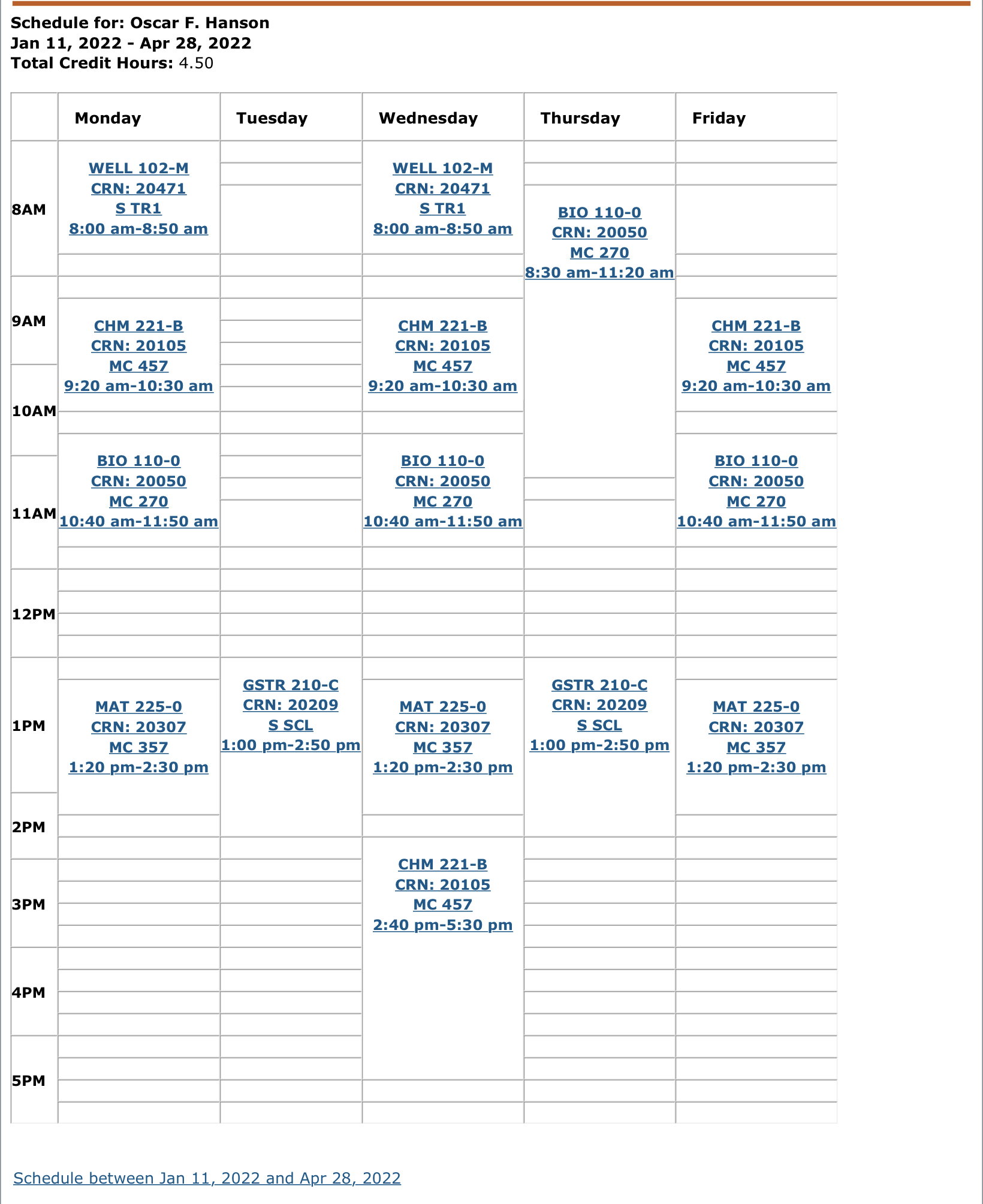 In this example, I took Wellness II, Organic Chemistry I, Modern Biology, and Calculus II on MWF and Writing Seminar II on TR, along with the respective lab periods as represented above.